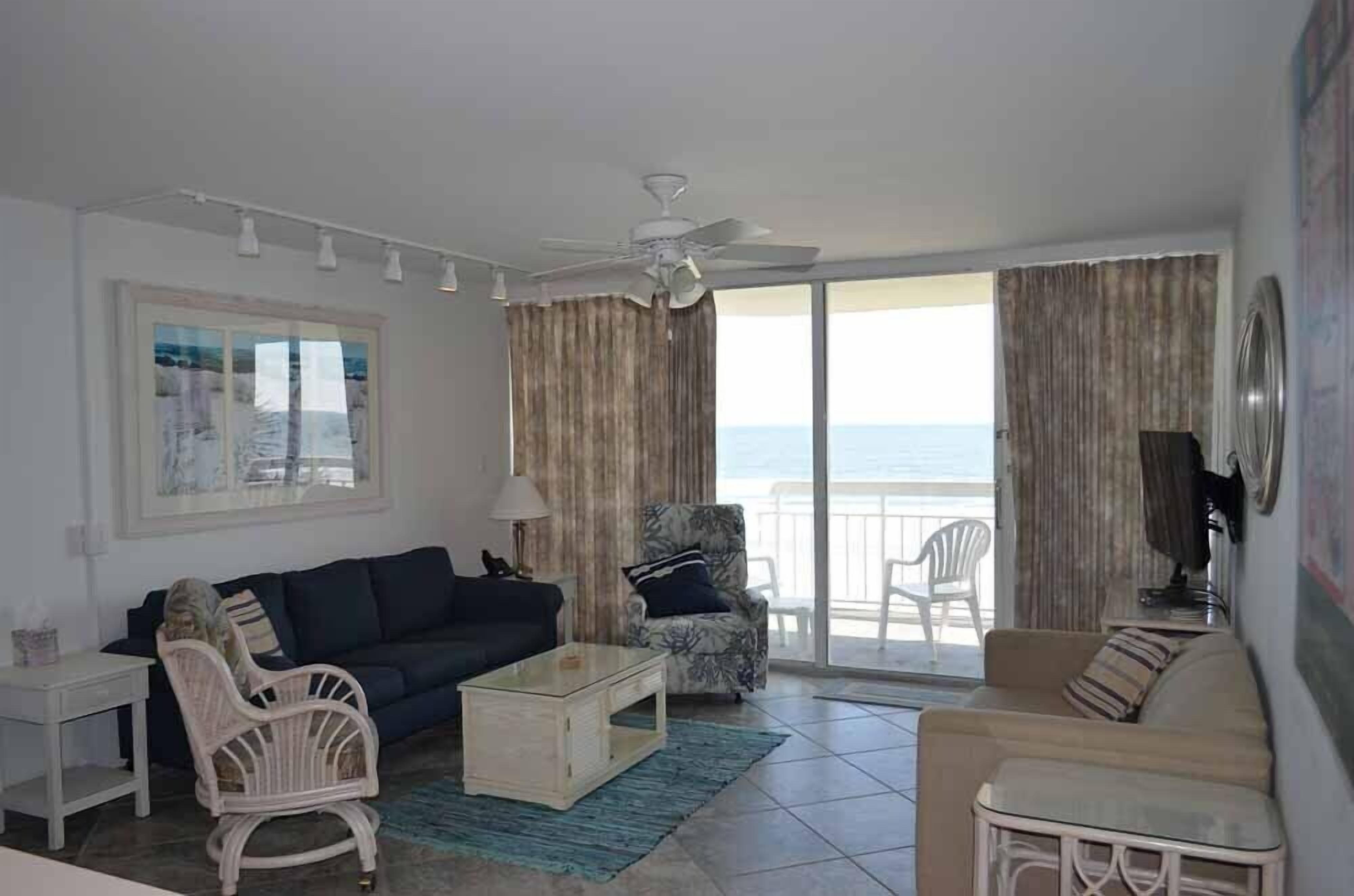 The ocean front balcony is located off the living room this condo is located on the 6th floor overlooking the spacious pool deck.